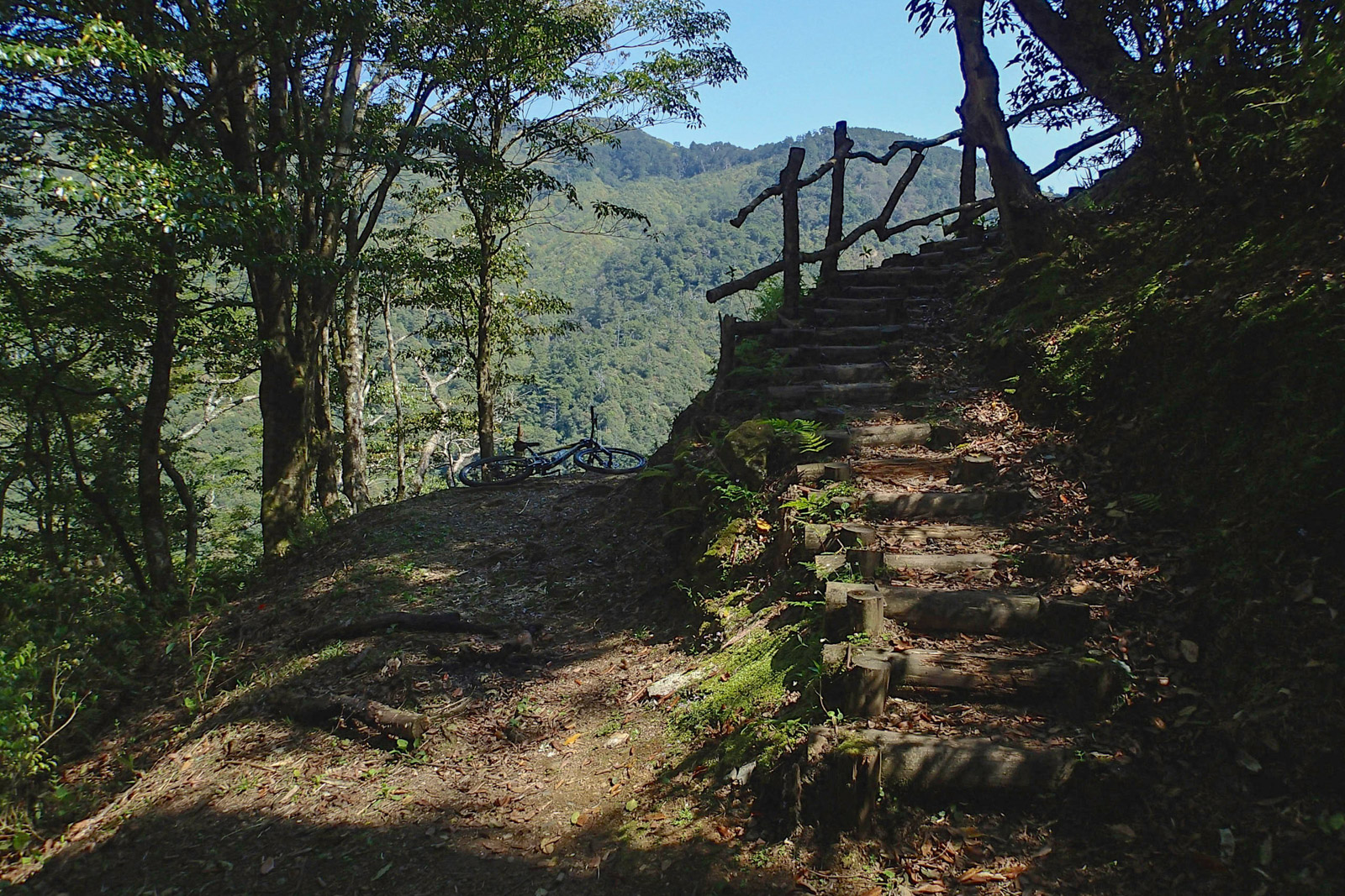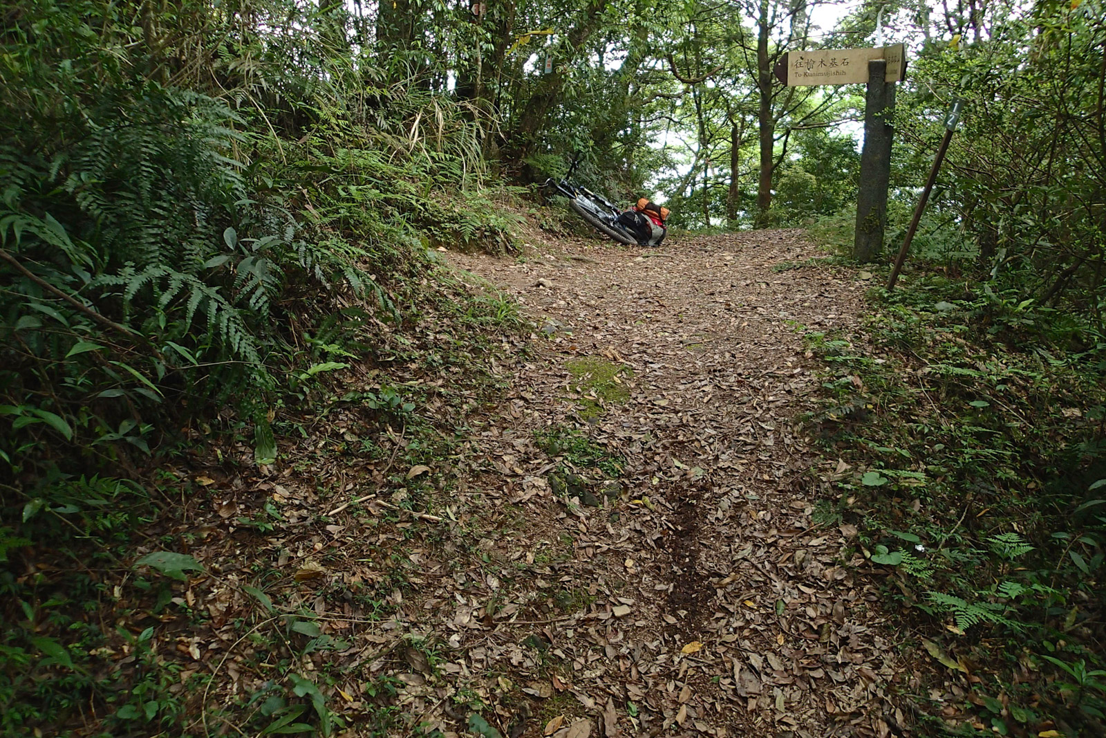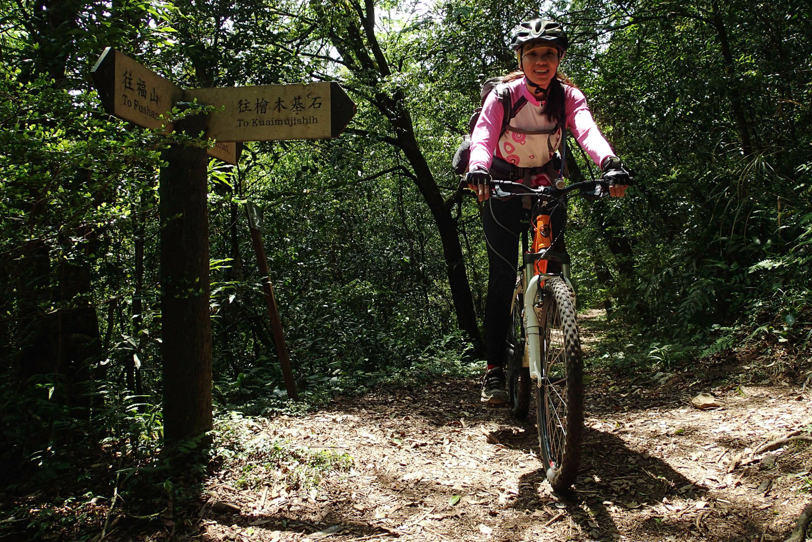 Na nic nečekejte a hurá na trail! Prvních 4,5 kilometru se trail vine mírně nahoru a dolů až do travnatého sedla mezi horami Lalashan a Tamanshan. Ze sedla se vám naskytnou nádherné výhledy zpět na osadu Bailing i na hranice Taipei, někde na konci údolí hluboko a daleko pod vámi. Z tohoto místa následuje 13 kilometrů úzké stezky sjíždějící přibližně 1400 výškových metrů do osady Fushan (福山). Trail je sjízdný přibližně ze 70%, pokud máte dobré kolo a pro strach uděláno, sjedete toho i více. Stezka po celou dobu klesá v prudkém svahu až do Fushanu a v některých místech je tak úzká, že ani nemůžete kolo vést vedle sebe. Nad vámi je prudký svah a pod vámi sráz někam hluboko do údolí (nebo alespoň milosrdné křoví). Na mnoha místech je trail přerušen sesuvy půdy, a tak je třeba s kolem na zádech opatrně přeskákat přes nebezpečné suťoviště. I když se může zdát, že se jedná o nebezpečný podnik, sjízdné to s trochou opatrnosti a dobrou technikou je a zaručeně se budete bavit a každý metr stezky užívat plnými doušky. A když vás přepadne hlad, využijte příjemný plácek (přibližně v polovině sjezdu), který zde zůstal po opuštěné japonské osadě. Na mnoho takových prostorných míst zde v prudkém svahu nenarazíte.