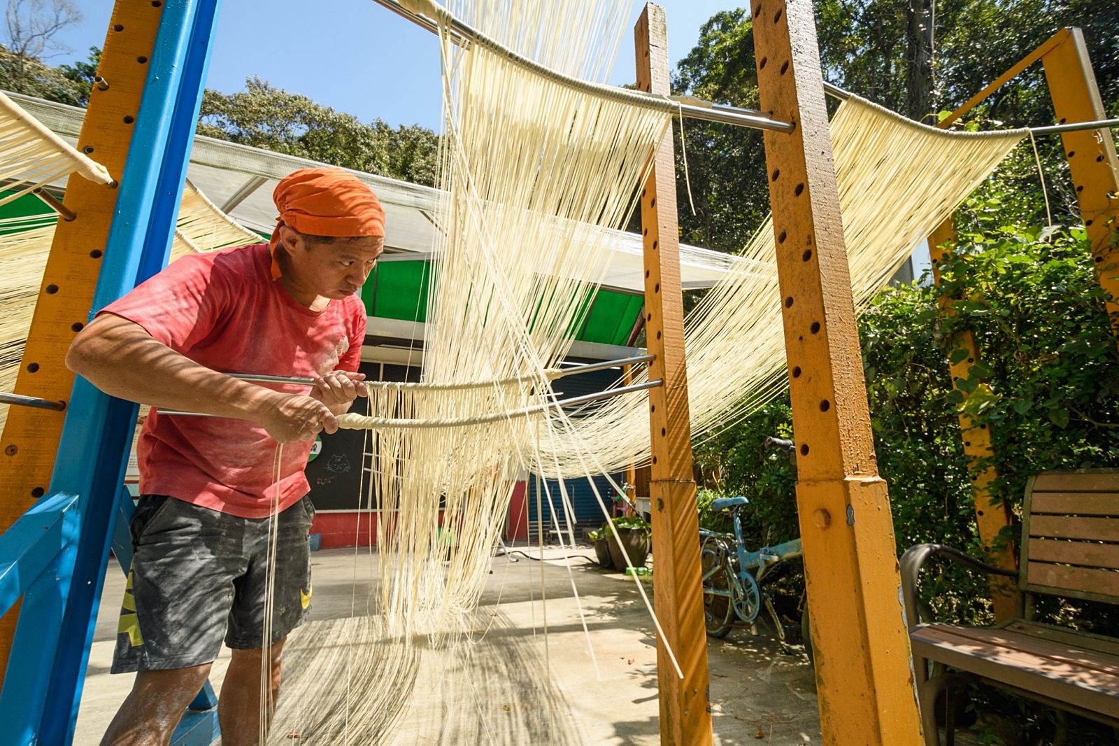 Nyní se nás ujímá jeden z místních zaměstnanců. Asi 5 minut s námi pobíhá okolo stojanů s hotovými produkty, které se právě suší a dělá nám profesionální fotografie na památku. Jakmile projdeme jednoduchým testem znalostí, dostáváme asi 3 kg syrových nudlí namotaných na dvou železných tyčích a následuje „Pull, shake. relax“ naostro. Pokud vše zvládneme, bude večeře!