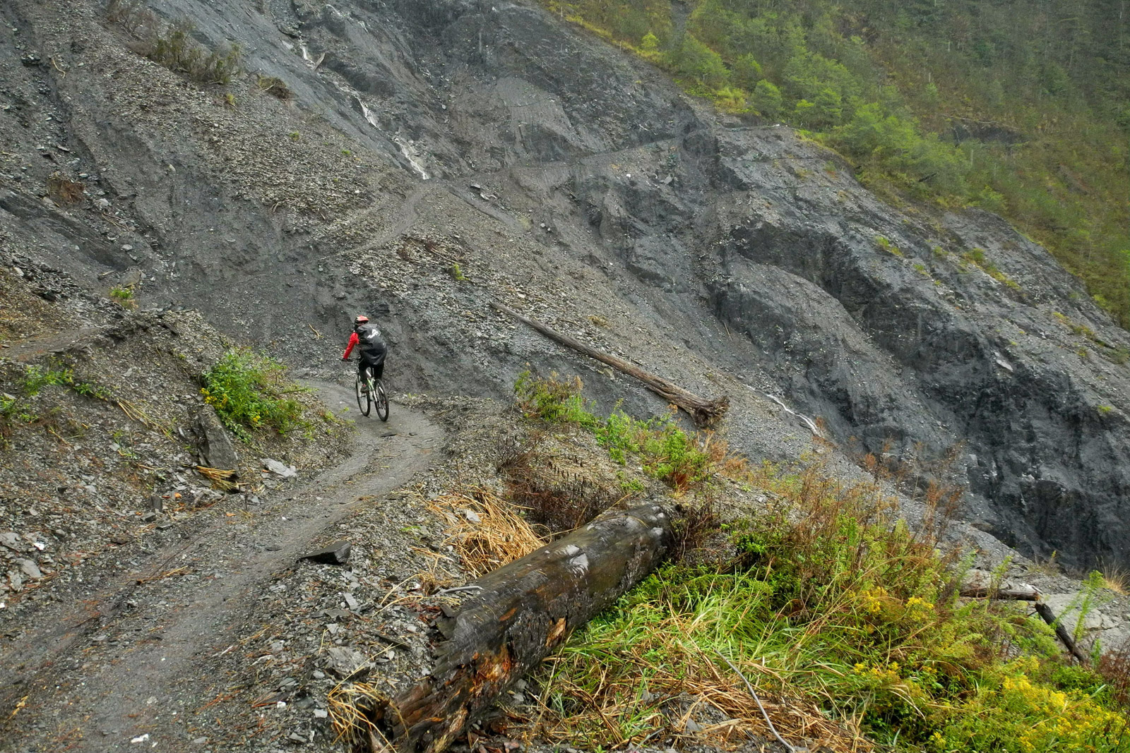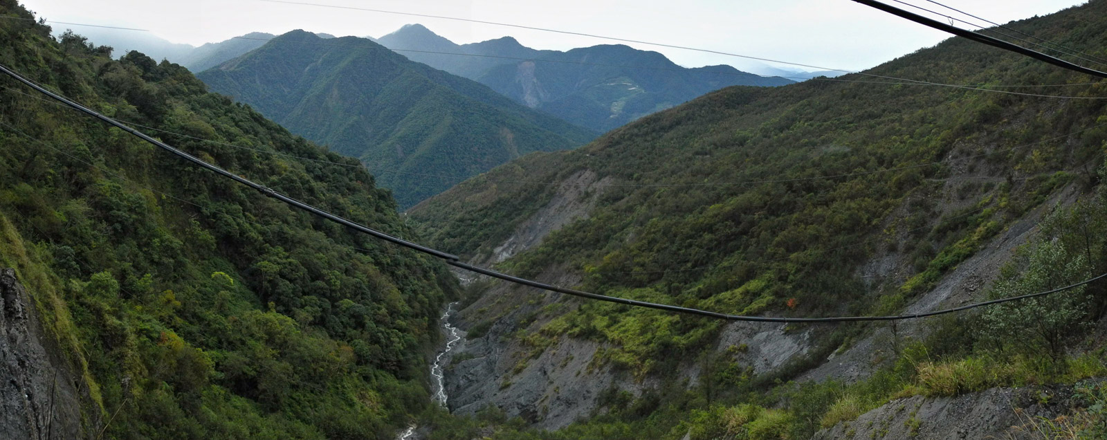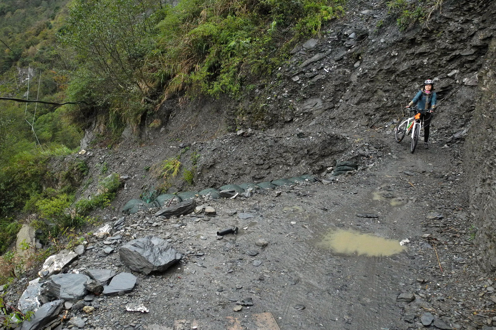 Po 3 kilometrech jízdy přichází opět hustá mlha a z vytrvalého deště se stává silný vytrvalý déšť. Částečně přejíždíme, částečně přenášíme další děsivě vypadající sesuv půdy. Asi 500 m široký a více než kilometr dlouhý sesuv tu vznikl po tajfunu století v roce 2009, ale další deště a častá zemětřesení jej dělají ještě horší. Cestou překračujeme 3 čerstvě spadané hromady kamení a jsme rádi, že jsme zase v pralese. Po dalším kilometru jízdy v hustém dešti zalízáme pod skalní převis a čekáme co bude dál.