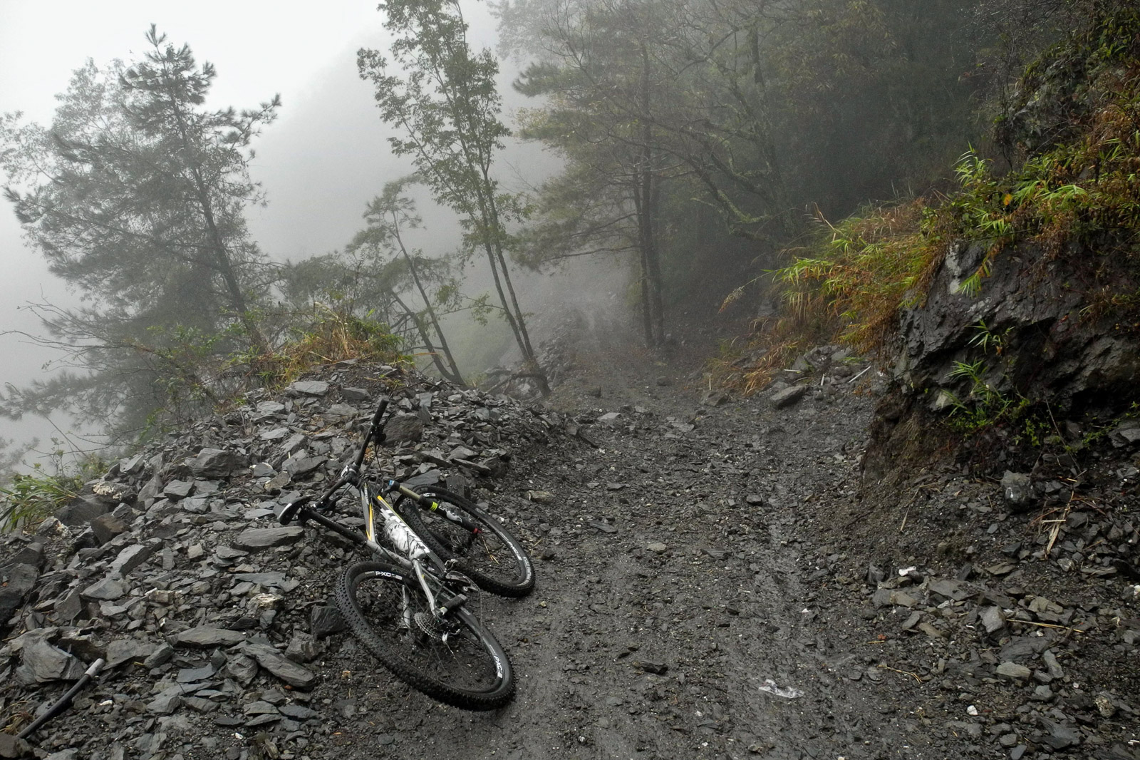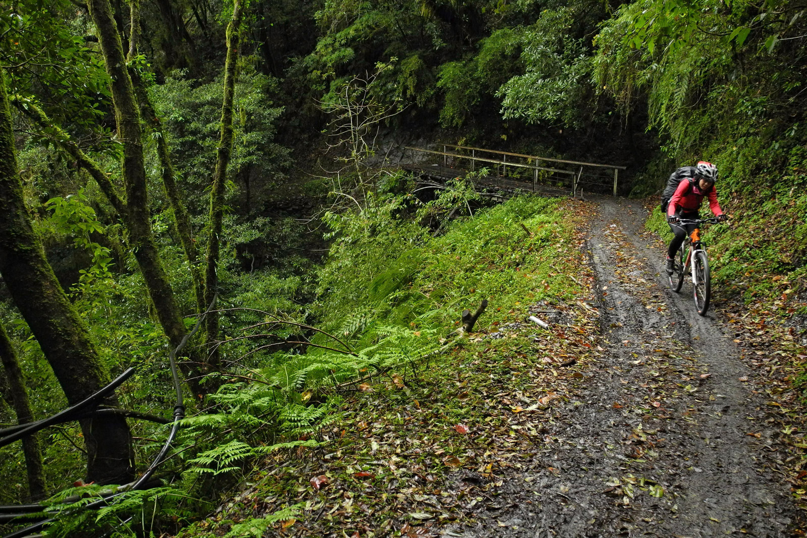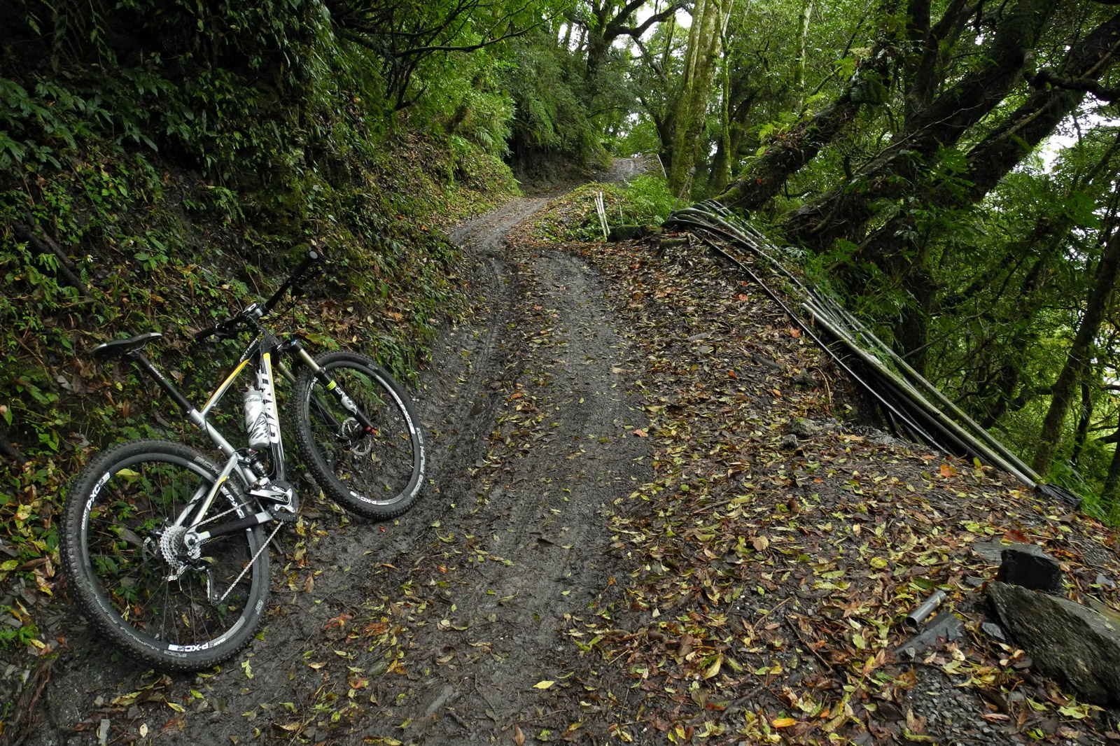 Po kilometru jízdy po úzké silničce nacházíme začátek 37 km dlouhé stezky Nenggao, kterou tady vybudovali původní obyvatelé a později za války rozšířili Japonci pro potřeby zásobování vojenských posádek vysoko v horách. I když prší, jízda po staré stezce nemá chybu! Úzká, kamenitá cestička se vine podél strmých srázů a i přes vytrvalý déšť se sem tam vynoří výhledy do údolí. Zpestřením nám pak jsou přejezdy děsivě vypadajících (a neméně nebezpečných) sesuvů půdy. Po prvním kilometru zajíždímě do pralesa. Stezka se mění na potok, bahniště a rochniště a jedeme víc kalužema než po pevné zemi. I přes déšť si ale jízdu stále neuvěřitelně užíváme.
