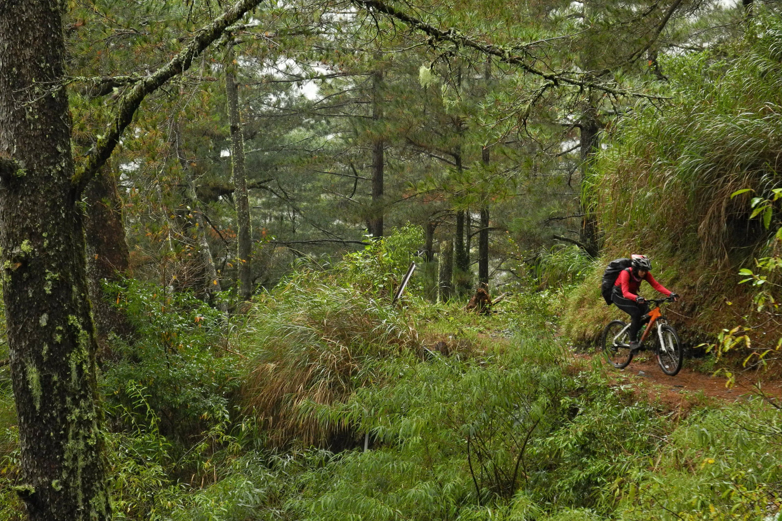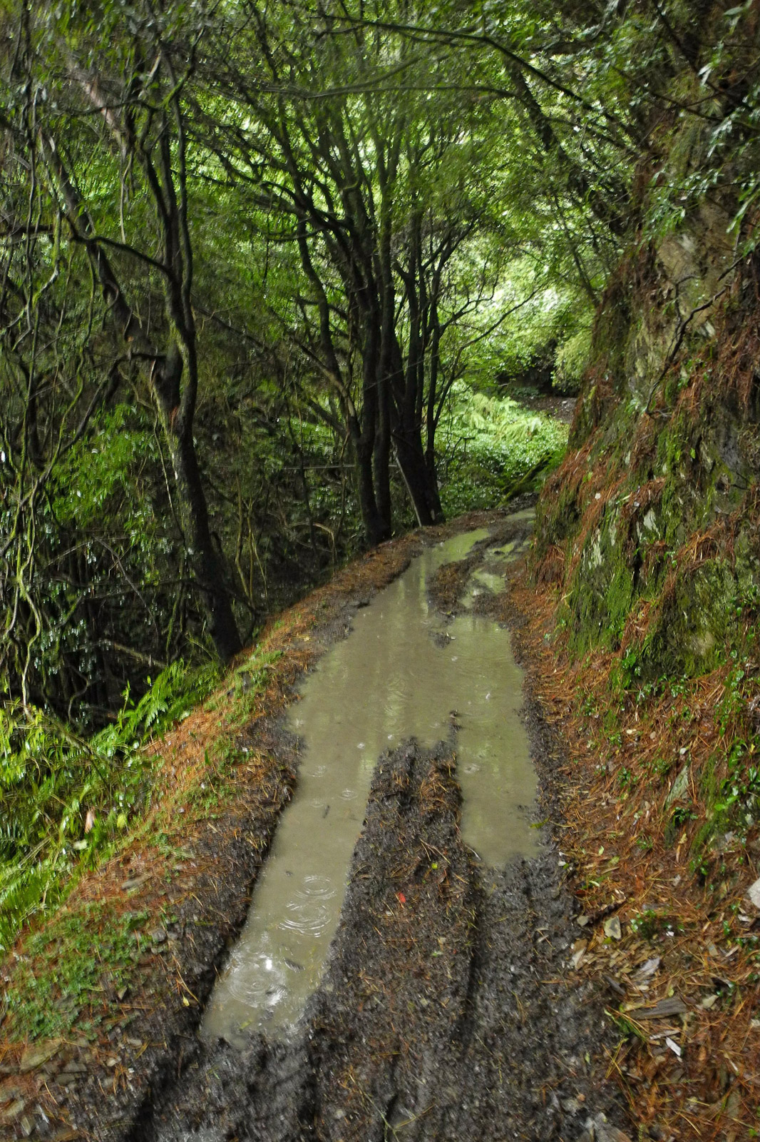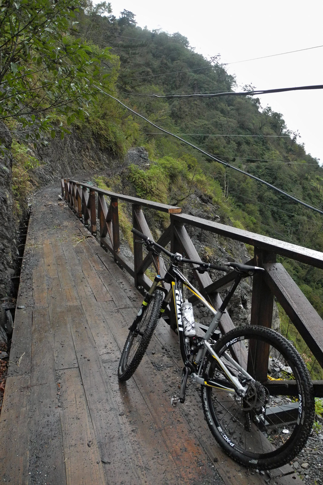 Po kilometru jízdy po úzké silničce nacházíme začátek 37 km dlouhé stezky Nenggao, kterou tady vybudovali původní obyvatelé a později za války rozšířili Japonci pro potřeby zásobování vojenských posádek vysoko v horách. I když prší, jízda po staré stezce nemá chybu! Úzká, kamenitá cestička se vine podél strmých srázů a i přes vytrvalý déšť se sem tam vynoří výhledy do údolí. Zpestřením nám pak jsou přejezdy děsivě vypadajících (a neméně nebezpečných) sesuvů půdy. Po prvním kilometru zajíždímě do pralesa. Stezka se mění na potok, bahniště a rochniště a jedeme víc kalužema než po pevné zemi. I přes déšť si ale jízdu stále neuvěřitelně užíváme.